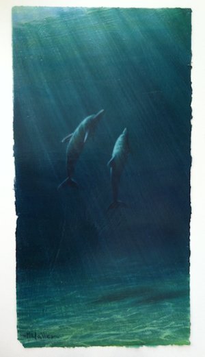 This is the section where you can "get your name in lights!" (well at least out there in the internet world!).If you have works in progress you would love to show off, or finished pieces you are particularly proud of, we would love to see them! We especially like to hear about the story behind the creation. Guys, I'm sure you want to show us your art! But you need to send us some images of your works! September's "name in lights" piece is from Mark's talented hand. This gorgeous little dolphin piece is painted on recycled watercolour paper, and will be part of the Lennox Artspace "Resurrection Exhibition" held in mid September. Mark's use of a Pthalo Blue, Forest Green & touch of Cadmium Yellow Light glaze over the middle of this piece; applied right at the end really gives it that super under-water dimension and depth.