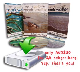Discounted DVDs Exclusively Yours! Don't forget as a valued AA subscriber you have access to our 3 pack of downloadable DVDs for only AUD$80.00! Click on The Link below and enter your password: Explore The Link Scroll to the bottom of the page to purchase your discounted downloadable DVD pack. Click here for information on the DVD downloadable 3 pack... What is The Best Paint? The best paint does what you want. Explore some of the characteristics and possibilities of the best paint for your painting practise. Click here to read more... Bathurst Summer School "Brushwork Simplified" is the title of Mark's class with the Mitchell School of Arts in January 2013. Click here to read more... Workshops in December & January Thanks for helping us solve our dilemma last month! Based on your preferences we are offering 2 x 1 day workshops in early December 2012 and early January 2013. I am taking your bookings for these workshops right now! Click here for more info...