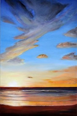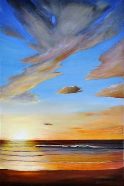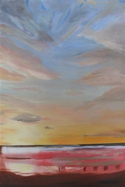 This is the section where you can "get your name in lights!" (well at least out there in the internet world!).If you have works in progress you would love to show off, or finished pieces you are particularly proud of, we would love to see them! We especially like to hear about the story behind the creation. Our WIP this month comes from Geraldton artist Helen Beard. Here is her journey: "I found this painting quite a challenge. My daughter is a very good photographer, and I spotted a photo she had taken of a sunset at Cable Beach in Broome, Western Australia, and thought I would like to paint it. I usually only paint from my own photo’s as I like to have been at the spot. Sunsets are fleeting things though and very hard to capture. I had the idea in my head of making the painting tall to get the effect of it coming back over the viewers head. As I later struggled trying to bring some clouds forward some back and some over the top, I came to the conclusion I must have been mad. My initial underpainting was grey and red. I later cleared away some of the clouds to get a more open effect. I had some problems getting the perspective right so I ended up turning the photograph and the painting up-side down to clear my mind and see the painting objectively. I decided I needed to have a break from it that or do it an injury, so I started painting in watercolours, I know. My husband was very confused. It all turned out well in the end though, as the change of media sparked up my enthusiasm and I got back into it. All of a sudden I could see what had to go where, and how I had to soften the clouds, and put the shadows in the right places. It was difficult because in this painting warm colours were at the back and front but the principles tone and light still applied." Thanks for sharing Helen, we think you've done a great job.