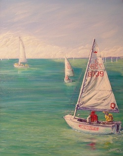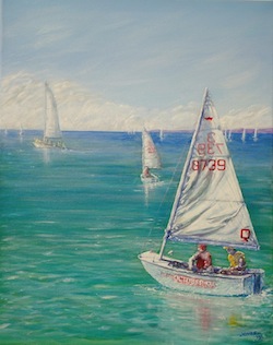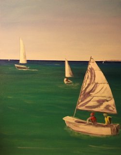 This is the section where you can "get your name in lights!" (well at least out there in the internet world!).If you have works in progress you would love to show off, or finished pieces you are particularly proud of, we would love to see them! We especially like to hear about the story behind the creation. This month's post comes from a great friend of Explore Acrylics, student of life, and super Action Woman, Kathy Jonas. This is a bit of a lengthy one, but well worth the read, trust me! From Kathy: "Luffing at Norfolk Point" I started this painting back in May with the express desire to enter the d’Arcy Doyle Art Competition. Just one of those things I wanted to experience, as I had never dared to even consider that I could do such a thing! This is that journey….. I was taking a few photos down at Norfolk Point near Manly on an almost windless day, watching the Sabot crews go through their moves. It was obvious they were really struggling to catch a breeze close into shore, and I noticed the sails spill out the air and start flapping as the crew turned the boat. This, my husband tells me, is called “luffing”. So the idea was born. First the underpainting - gradations of colour and setting out the shape of the boat initially went well, until I discovered the perils of painting something where you can’t use artistic license. A Sabot is a Sabot, and has a particular shape and size about it. My husband is a bit into sailing (which is why he knows all about luffing) and ever so gently suggested that the boat looked a little out of proportion. After chucking a tanty I re-checked my reference photos, held up my thumb, then my paintbrush, then gave up and picked up a RULER and checked overall dimensions. Short story is that I repainted the hull and sail (after saying some nice apologetic words to my husband, who is still with me). The beauty of acrylic paint is that it hides such indiscretions, which is more than I can say about my damaged pride (I am surprised I even included the ‘bad’ photo – hope you feel privileged). At this point the painting became “Das Boat” and was the subject of many discussions over dinner! As you can see by the progress photos I have had a few changes of heart during the process. I stuck (technical term) some clouds on the horizon, softened the colour of the water – all in an attempt to make the view realistic, but feel that I actually washed things out too much. A chat with Mark after one of our workshops made me understand that we can be a bit bolder with our use of colour, especially when creating shadows, creases and folds (I’m pretty happy with my interpretation of the sails) and creating reflections in the water. There was a "captain obvious" moment when it was pointed out that the boats in the background were as clear as the main subject – so they were ‘blurred’ to ensure they receded further into the background. So, in late June "Luffing at Norfolk Point" went on display at the Doyles. Whilst not the best there I must say I wasn’t the worst, which was a relief. The best thing about entering was the opportunity to see what other people are doing, and to realise you are just like everyone else there – nervous and worried that people will actually like your work. It was interesting to see the winning/commended works, as this was a lesson in itself – they simply “stood out”. Size (definitely added to the wow factor), subject, composition, colour or quirkiness. Interesting. Luffing at Norfolk Point #2: Since the Doyle’s my little painting has been hanging in our hall, and I pass it daily, making mental notes about what I can do to improve on it. A couple of days ago I brought it back into the studio (aka the spare bedroom) and started dabbling again - I have intensified some of the colours, which is where I felt I had backed off initially, and added a bit more refraction to the water in the foreground, with an attempt to make it ‘come forward’ a bit more. I will leave it alone after today, and put it down as a learning experience. I feel I have learned about being braver, bolder, the need to be ACCURATE but, most importantly, that I have nothing to fear. As Mark often says, no one will die; it is only paint after all! Happy painting!" Thanks for sharing your journey Kath - such an entertaining story and so interesting to see so many of those processes we all struggle with in writing. Great job!