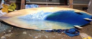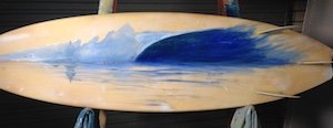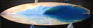 This is the section where you can "get your name in lights!" (well at least out there in the internet world!).If you have works in progress you would love to show off, or finished pieces you are particularly proud of, we would love to see them! We especially like to hear about the story behind the creation. This month’s painting is from our local postie, artist and general reprobate (and good sport), Brett McCormack: Big Lefty "I've turned my brushes to surfboards because I'm bored with the structured measurements of canvas. With this particular surfboard I wanted to retain as much of the original colour of the fibreglass and foam as possible, so that as the surfboard aged the colour would darken and accentuate the mood portrayed. Like most of my paintings I had no image to copy, or lines to follow and it quickly became a big left hander. I tried to re-capture the colour of the board to re-intergrate back into the wave. For me a painting is about layers, if I’m not happy about one layer I go over it, if I am then I use it. Overall I'm happy with the image, surreal or whatever, but at the end of the day it's better than it looked. Like it or not!” Thanks so much Bretto for submitting your wave for us, and your process behind painting it. Most excellent!
