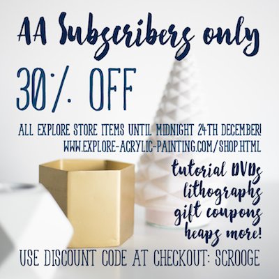 1st December 2015, issue 045 Passionate about painting with acrylics? Need a monthly fix chock full of inspiration? Need some help to take the pain out of your painting process? It's all here for you. Acrylics Anonymous. Zero elitism. Dive in. If you enjoy Acrylics Anonymous, and you know someone who might also enjoy it, you can share by forwarding it to your friends! If you are receiving this because a friend has forwarded this to you, and you would like to subscribe, click here!