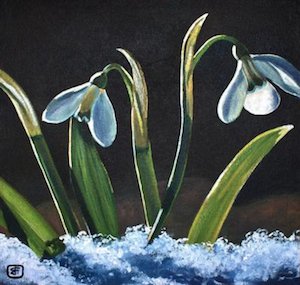 to showcase. You can even nominate someone if you like. (Or yourself!). To do this, check out the forum and then send us an email! It’s that easy. This month we’re focussed on artist Bonnie Fontaine, from Rhode Island, USA., with her painting, “Snow Drops”. Always at this time of year I start searching around for paintings to make me feel “cooler”. It’s so hot in Australia at Christmastime! Bonnie’s painting has used colour to great cooling effect in her piece. Well done Bonnie! Read more about Bonnie Fontaine "Snow Drops"