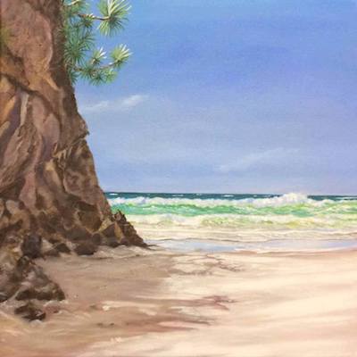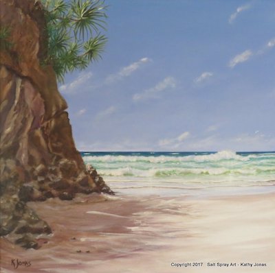 This is the section where you can "get your name in lights!" (well at least out there in the internet world!).If you have works in progress you would love to show off, or finished pieces you are particularly proud of, we would love to see them! We especially like to hear about the story behind the creation. This painting comes from one of our original supporters, the gorgeous and talented human being Kath Jonas, from Brisbane Australia From Kath: "South Gorge – North Stradbroke Island" Straddie is my special place, and takes centre stage in many of my paintings. South Gorge is particularly lovely – this day I observed and photographed it at low tide – loving the striking rock formations, the long stretch of sand leading down to the water’s edge, warm autumn light filtering onto the beach – just perfect!