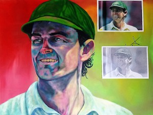 This is the section where you can "get your name in lights!" (well at least out there in the internet world!).If you have works in progress you would love to show off, or finished pieces you are particularly proud of, we would love to see them! We especially like to hear about the story behind the creation. This month's story comes from talented portrait artist, and Lennox Arts Collective regular, Brett Belot :) From Brett: "Hi everyone, I am a passionate professional portrait and sports artist who has been painting bright and bold images that tell unique stories for over a decade. My latest series of portraits titled, “Superstars & Signatures” has me painting striking portraits of sporting superstars who have amazed us with feats of courage and inspiration on the sporting field. But just as important to me, is what they are doing off the sporting field. My portrait of former Australian Test Cricketer Adam Gilchrist was painted from a photograph chosen by Adam that he describes as “The highlight of my career”. The process was as follows: As I already had a canvas painted in Atelier acrylics with blended reds, greens and yellows, the first step was to block in the darkest tones and outline with Pthalo Blue. I am mindful to not get bogged down in too much detail at this stage.