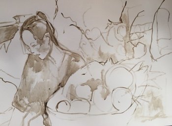 I tried to show some of the tones, and started to add a bit of colour. I have not put in the whole scene - I really knew that I would be adding and removing details when I moved ahead - what was important was the woman, her fruit and the Hindu statue behind to give the work a sense of narrative and context.