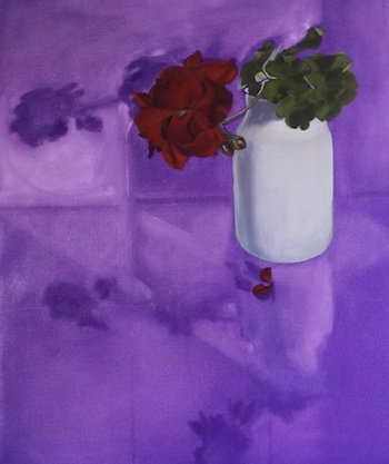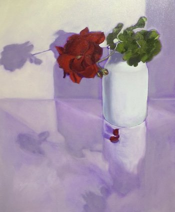 After recurring episodes of self doubt, I decided to forge ahead. As the progress pics show, my underpainting choice was difficult to tame, however the final result was a very happy miracle! Sweet little glimpses of violet pop through in the shadows and reflections which I think is really nice... cadmium red light layered over the deep violet tone of the underpainted petals helped create magical velvety petals.. another little miracle!