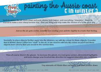 Workshop in WA Mark is keen to come back to WA for a workshop and a couple of demos in September. If you're keen to come along to one or more of these events, send us an email through the link below and let us know! Email us through the contact form here. Want to paint whitewash, suds and waves? See our latest Youtube clip for a great 10 minute tutorial on this very subject! P.S. This painting is also in our Works In Progress section towards the end of this ezine. Check out the whitewash, suds and wave tutorial here.
