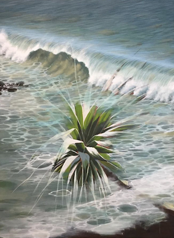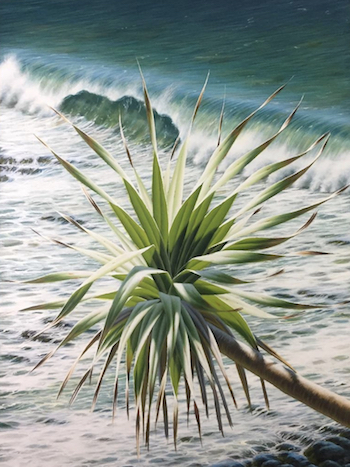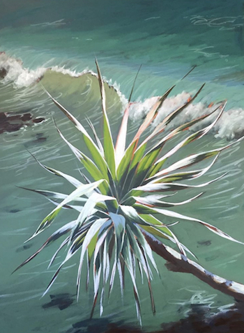 This is the section where you can "get your name in lights!" (well at least out there in the internet world!).If you have works in progress you would love to show off, or finished pieces you are particularly proud of, we would love to see them! We especially like to hear about the story behind the creation. This month's submission comes again from our very own Mark Waller. From Mark: "Every now and then an image grabs you by the scruff of the neck and throws you into the studio. I went out to get some photo references for a commission piece that I was doing, and there was a really nice swell running - offshore, and big clean lines out at sea. I sat up on the cliff after I’d taken some photos, just looking at the swell. There was this little bay, and these waves were smashing into the bay, and I just loved the idea of the rocks just underneath the surface, and the path being left by the suds, and the wave and the spray coming off it. So I took a pile of shots and decided that it also needed a pandanus tree. So, it’s a pandanus tree with suds in the background :)