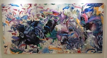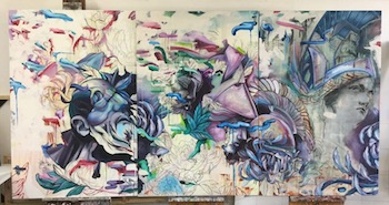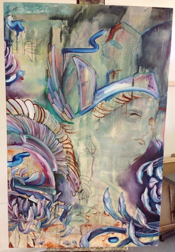 This body of work is three large canvases hung side by side to create one large piece for impact. The beginning of the process was to lightly sketch the whole canvass to roughly lay out the images. Watercolours were then used to work out the colour palette and I then I used inks and a spray bottle of water to create runs. Details were added to the portrait faces using oil paint on all three canvass and also the flowers were added in oil.