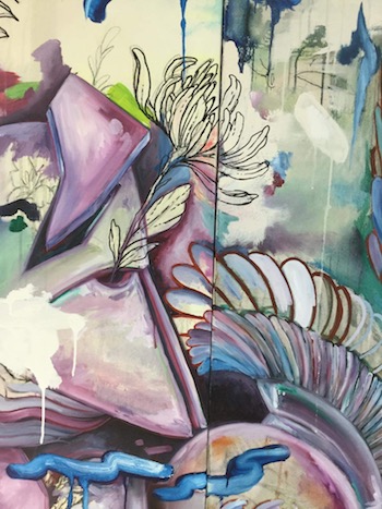 Other layers were then added using a mix of oil, acrylic, charcoal and ink to add abstract and depth. There was a constant checking in and morphing of the artwork throughout the whole process, many times things were added or adjusted according to the feel in the moment. The end result was then coated in a finish medium AS (Art Spectrum) Gloss varnish. Image details: Title: Unfolding Medium: Mixed medium of Oil, Acrylic, Charcoal and Ink on canvas Size: Three canvass each 100 x 152cm