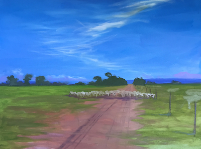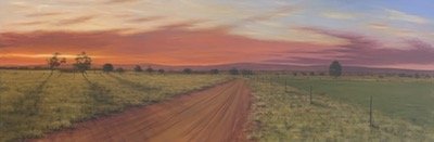 I re-painted the sky, putting some more detail in it and tweaking the colours slightly, and moved down into the landscape once I had established the light source and its nuance. From there it was adding strength to the shadows and highlights, lots of dry brush technique on the grass in the foreground to give that lovely Australian country scraggly-grass feel, and glazes in the background to soften things in the distance, and to get that “warm to cool” process established.