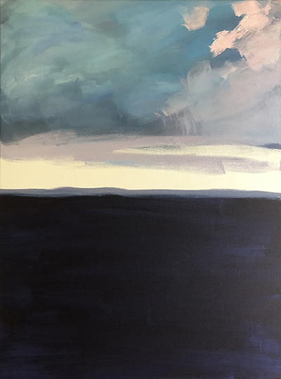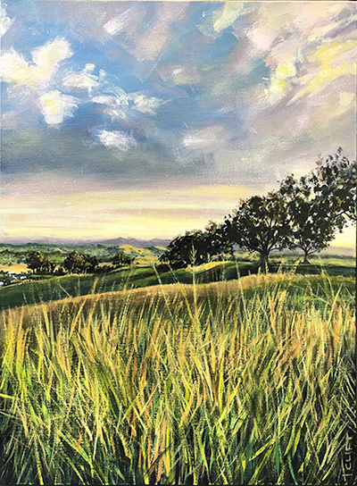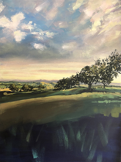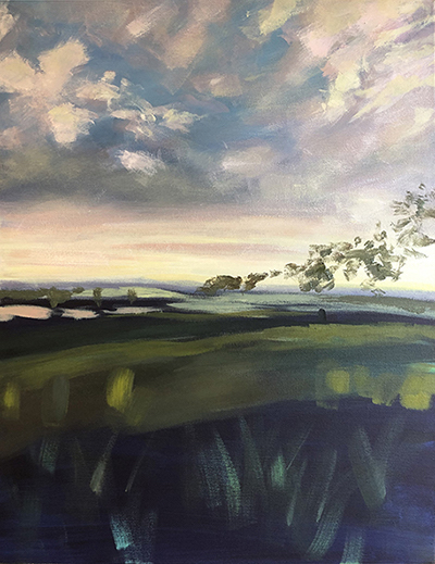 Once my background colours were blocked in, I worked from the back (and top) of the picture to the front, first creating the sky. I enjoy painting the sky, especially when there are clouds capturing moody light, as it is a subject that allows me to be fairly loose and free with my brushstrokes. I can be an impatient painter, but I find the sky often comes together quickly for me, which suits my artistic temperament. I also tend to leave the more difficult parts of my work to the end, perhaps so as not to get despondent early on in the painting.