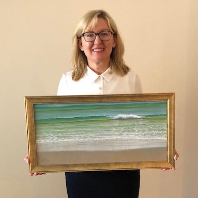 Meet Inga! Here's Inga with her winning painting from our "Landscape With Lake" competition held back in 2019. Inga actually won a day in the studio with Mark but seeing as she is from The US and then Covid hit, she opted for the original painting prize instead! Here's a few words from Inga: "My name is Ingrid, I live in Southern California and I work as medical professional. In my spare time I learn how to paint. Mark Waller is my first art teacher. My first painting was a sunset gradation of colors. I’m so happy that I won the contest and received Mark’s original painting." See what you can win just for being involved :)