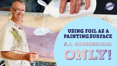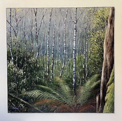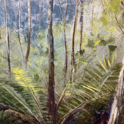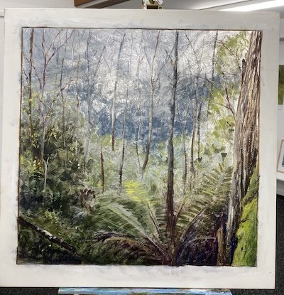 This is the section where you can "get your name in lights!" (well at least out there in the internet world!).If you have works in progress you would love to show off, or finished pieces you are particularly proud of, we would love to see them! We especially like to hear about the story behind the creation. This month's submission comes, again from our very own Mark Waller with his painting "Shimmer". From Mark: "On a recent trip to Tasmania, my wife and I walked through a National Park into a place called Snug Falls. As we dropped further into the valley, the air became cooler, the vegetation changed, and there was a mist that softened light. There was almost a metallic sheen to the air in the distance. Of course I took about 8000 photos. Still in Tassie, I went to a gallery and came across these wonderful photographic prints on aluminium panel. There was a lovely sheen to them. I couldn’t help seeing the parrallels between those images and some of the ones I had taken photos of. When I got back to the studio one of the first things I did was buy a couple of meters of foil, and started experimenting with gluing them down.