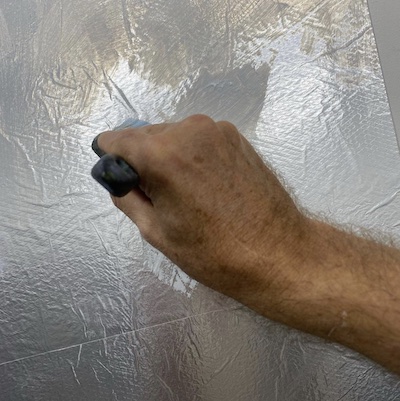 Both Binder Medium and Heavy Gel Gloss are fantastic for that, although I recommend using Heavy Gel Gloss on canvas because the canvas is a bit more flexible. I wasn’t trying to get the surface perfectly flat. After I was sure it was stuck to the canvas, I gave it a couple of coats of Heavy Gel Gloss to hide any seams and to give it a bit of build, and then when dry, a coat of Binder Medium so that the paint would stick. I had to paint this in an entirely different way from usual, because I wanted the foil to show through here and there. I used Atelier Interactive for this project because it’s a little more transparent that Free Flow. And I wanted that lovely silver to come through.