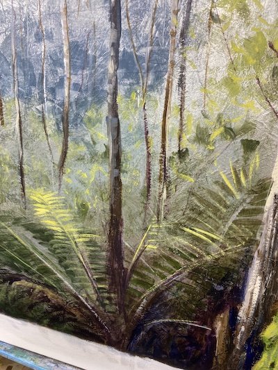 I dragged the edge of a finer brush here and there across the picture to suggest that the sunlight was hitting branches here and there. I then mixed up some more green - French Ultramarine Blue, Forest Green, Dioxazine Purple and Cadmium Yellow Medium. The colour leaned still towards blues. I then pushed that as a glaze in around the closer areas to the bottom of the picture and the foreground, to create some contrast and dimension between that area and the distant blues. I started to establish the shapes of the foreground tree fern. Still very broad strokes at this time just to define it. At this point I lay the painting on the floor and flicked a few greeny-blues and olivey colours over it to suggest flashes of colour in the mid/foreground area.