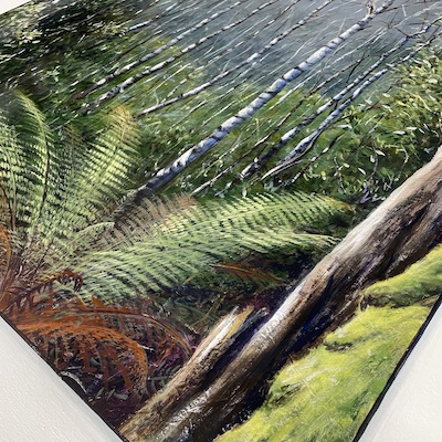 I used quite a fine brush and started working on the leaves of the tree fern that were in shadow, and gradually added more yellows and whites to areas that were being hit by sun, and pushed some bluer colour into some leaves to create the impression they were leaning away. I did something similar with the dead leaves in the foreground, rather than using the greens I used Burnt Umber, Dioxazine Purple and Cadmium Yellow Medium. Lovely rusty dead fern leaves. This also had the benefit of bringing some warmer colours into the foreground, which added to the illusion of dimension. It was a simple matter then of coming back here and there with leaf highlight colours, tree trunk highlight colours and adding flecks of colour all over the picture. I finally tightened up the moss on the tree trunk in the foreground, deepened some shadows here and there in the picture, and voila it was done.