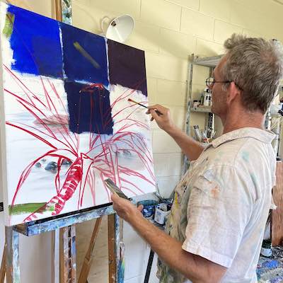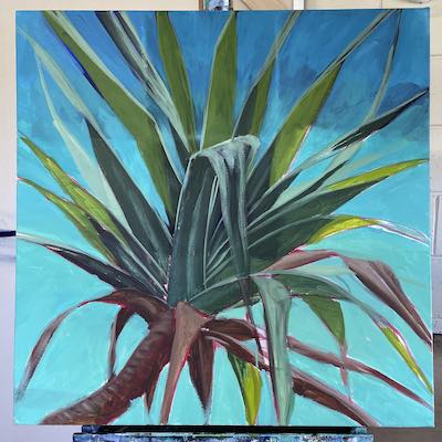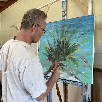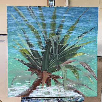 I mixed French Ultramarine Blue with Forest Green and some White, and suggested sky being reflected on the leaves in the shadowed areas. This adds to the illusion of leaves leaning toward you, or tilting away. Layer upon layer upon layer. I mixed Burnt Umber, French Ultramarine Blue and White, and painted the highlights in the shaded areas on the dead leaves and the trunk. I used neat Burnt Umber on the tips of the leaves. From here on in it was pretty much tidying up the edges of the leaves, the transitions and gradations within the leaves, adding scratches and serrated highlights (neat White is great for that in full sun). I strategically added a few highlights on the leaves to suggest the light shining through the leaves above, and to create a little more interest, and VOILA. A(nother) pandanus painting :D For Mark's website, click here. For Mark's Facebook page, click here. We hope you enjoyed this issue of Acrylics Anonymous! If you have any suggestions, comments or feedback for the ezine or our site, please don't hesitate to contact us. Until next time, make sure you stay safe and well, and don't forget to chuck some paint around! Cheers from Frankie & Mark :) For our Youtube channel, click here. To join our Youtube channel as a member for a few bucks every month (in exchange for even MORE awesome perks, click here. For our Instagram, click here. For our Website, click here. For our Facebook page, click here. For our Pinterest, click here. For our Tik Tok, click here. |