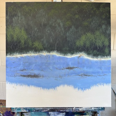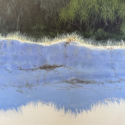 Using combinations of French Ultramarine Blue, Dioxazine Purple and Cadmium Yellow Medium, I created the illusion of striations in the face of the sand dunes. I find it really intriguing that the wind will push sand on top of foliage repeatedly, and then eventually the ocean uncovers all of those layers. There is so much nuance in the face of those dunes. I worked through this area being mindful of the sky being reflected on certain parts of the dune, and the light reflected off highlit sand on other parts.