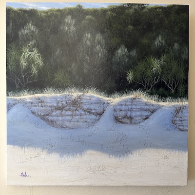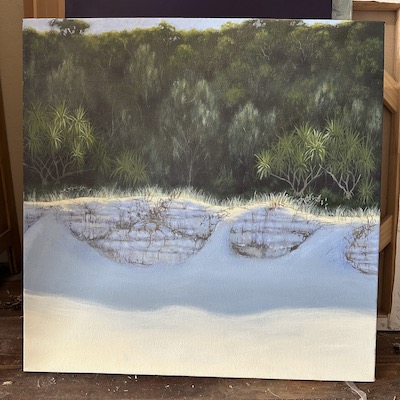 I went back to my original ādune shadow colourā and suggested the shadows of the spinifex being cast onto the sand in the foreground. From that point on it was a matter of using a dry brush and Burnt Umber to suggest vegetation, moving into and out of the shadows in both the foreground and the highlit dunes. Iāve painted variations of this image at least 10 times, and even writing this make me want to paint another one!