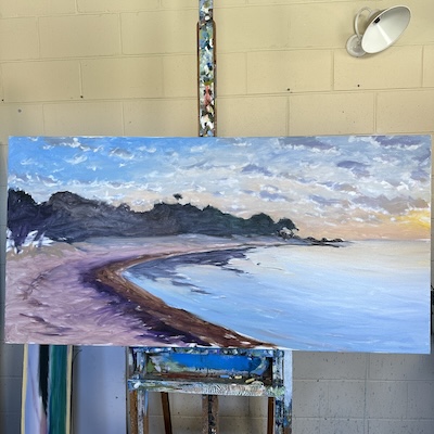 I wasn’t completely sold on the sky I had chosen, and found another one that seemed to fit the picture better. I quite liked the drama of the clouds echoing the shape of the land in some small way. I brushed in some of the detail in the trees in the darks, to get a sense of where everything was, and blocked in the reflections, clouds and sand. Because the light was low, there were long shadows in the shell grit on the beach. I wanted to replicate that. So at this point I put the canvas on the ground, on it’s edge, to flick combinations of Burnt Umber, Dioxazine Purple, Permanent Alizarine and White to splatter and create that coarse sand and the shadows drawing out from it.