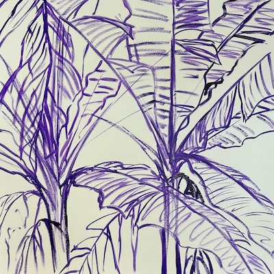 This is the section where you can "get your name in lights!" (well at least out there in the internet world!).If you have works in progress you would love to show off, or finished pieces you are particularly proud of, we would love to see them! We especially like to hear about the story behind the creation. This month's submission comes once again, from our own intrepid traveller, Mark Waller :) From Mark: "Going Bananas" I have a lovely little stand of banana trees in my garden, in the chook pen. It’s really quite lovely to go down and watch the light filter through the leaves. I first started painting banana trees on a workshop in Fiji many years ago. And for some reason forgot I had my very own references growing right there. I went down to check on the chickens, and saw this wonderful light making shapes on the leaves. Well, that had to be painted, didn’t it! When I had the recent opportunity to do some filming for the Colour In Your Life “re-boot”, it was a perfect excuse to drag out my photo reference, and start something dynamic and bright for the show. I grabbed Dioxazine Purple and roughly made up some broad shapes to start establishing where I thought the leaves should go, the lines, directions. Keeping firmly in mind that all of this will be in a state of flux as we go along. Things often don’t stay where I put them.