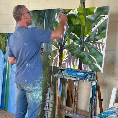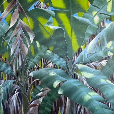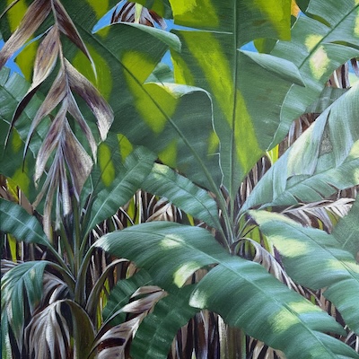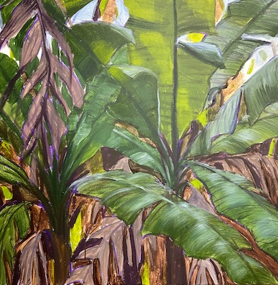 Now it was a matter of refining the details and adding layers - a lot of backwards and forwards, pushing up the highlights, bumping up the backlit leaves, building the colour, creating nice blends and transitions within leaves etc, and moving things around to suit the eye. I also added some flashes of blue sky to help let a bit more light into the picture. I also put some strips of brighter colours into the areas at the bottom of the painting to let light into the shadows. I used Dioxazine Purple to help add some serious depth to those shadows at the bottom. Voila. I’ve gone bananas!