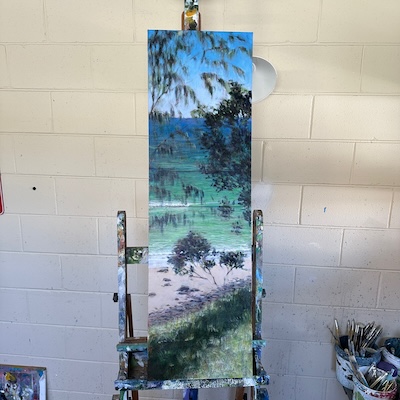 I mixed up a darker colour, Dioxazine Purple and Pthalo Green and a tiny bit of Cadmium Yellow Light and painted the shaded grassy areas on the bank, and the darker areas in the foliage. I scrubbed in some branches and then placed a few highlights on the wispy Casuarina tree leaves. So far, I’ve used one brush (a size 6 flat in case anyone’s interested). I repeated that entire process, making modifications to the colours and shapes as I went, but I was still using a small brush to allow the discrepancies in colour and brushstroke to remain in the picture. This creates a broken yet kaleidoscopic effect, which is one of the wonderful aspects of impressionism. Unexpected flecks of colour spread throughout the picture.