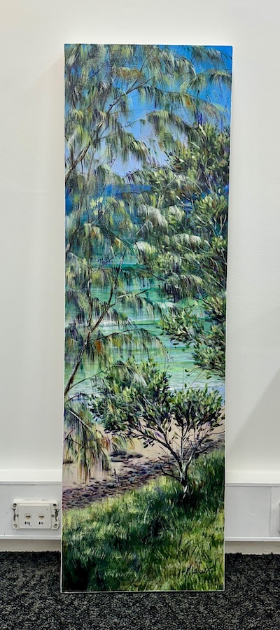I loosely painted the canvas with a coloured ground, based on Cadmium Orange, Dioxazine Purple and Cadmium Yellow mixed together and thinned (see Sealed Section video above). This gave me a foundation colour for all the work to come later. I chose this orangey colour because it contrasted nicely with the colour range I was going to paint. I wanted a simple image that was still spacious but one that didn’t really have a definitive focal point. I wanted to create the illusion of depth and distance, a bright sunny day and clear water, viewed through foliage specific to my area. And I wanted to “abstract” the marks without drawing attention to any particular area of the painting. The long skinny format with the steps from the foreground into the background, combined with the perspective broken by miscellaneous branches and trees, create a wonderful opportunity for abstraction, a looser approach and to actually play with the dynamics of paint, creating a