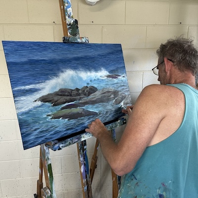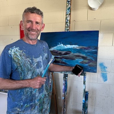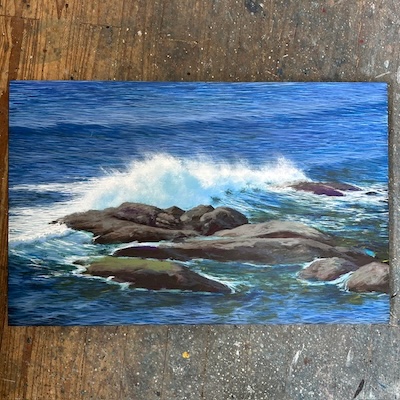 This is the section where you can "get your name in lights!" (well at least out there in the internet world!).If you have works in progress you would love to show off, or finished pieces you are particularly proud of, we would love to see them! We especially like to hear about the story behind the creation. This month's submission comes again from our valiant visionary, Mark! From Mark: "During our recent Tassie trip, we did a day at the Bay of Fires. Of course the colour of the rocks is fantastic, but I as always was drawn to the water and waves. It was quite a windy day, and I loved the way the spray was being blown into the air, and the suds pushed around the rocks. Oh no, another wave/rock painting!