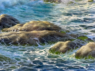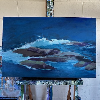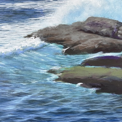 From there I mixed French Ultramarine Blue, and tiny bit of Cadmium Yellow Light and White and roughed in the suds shadows. It was late in the afternoon, and I wanted a tiny bit of the gold that was reflected off everything at that time of day to "yellow-ify" the whitewash. I mixed up some sky reflection colour using Dioxazine Purple, Pthalo Blue and White, and created the illusion of wavelets in the background. I then mixed some neat White with a tiny bit of Cadmium Yellow Medium, and with a fan brush, ran around the edges of the rocks creating the impression of spray and whitewash bouncing up.