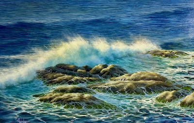 I came back finally and put some highlights on the rocks to suggest that the sun was hitting them, leaving the rock behind the exploding water bare of highlights to create the impression that it was in shadow; then reflected some blue on the rocks that were in shadow, to give my shadows some depth. The last part of the picture entailed me using White and a tiny bit of Cadmium Yellow Light to run rivulets of water down the rocks to suggest water running off them, and repeating that process with French Ultramarine Blue and White to also create the illusion of shaded areas. The rest of this painting was tweaking that process, gradually adding little touches of light and shadow here and there.