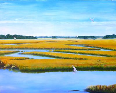 He provided me a photo to work from. He wanted a golden marsh at high tide, a sailboat in the distance and a few spoonbills. They are usually quite pink but he hates the color pink. I was so lucky to come across this website and look at the many tips. I had started using Atelier Interactive paints about 2 years ago but had never used any medium. Most of my paintings were small.