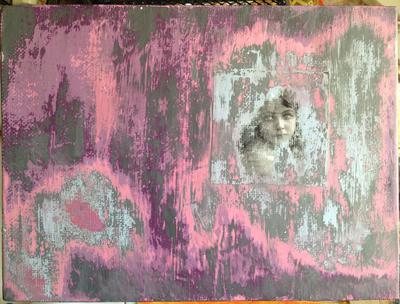 Start by sealing one or more images onto your working surface. This one is a small wood panel. Choose your color palette and put down layers of each one letting it dry just enough so the next layer won't mix, but sit on top. You may want to thin the paint a little so you don't get thick layers. After the last layer (4 is probably the max you want) the messy part starts. Get lots of paper towels and a bottle of alcohol. Isopropyl 91%, not the drinking kind. Of course it doesn't hurt to have a little of drinking kind around also to add to the fun. Dip the paper towels in the alcohol and start rubbing off sections of paint. This is easier if the paint wasn't allowed to get too dry. Reveal part or all of your images, take off as much or as little paint as you like. Just have fun with it!
