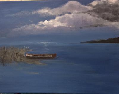 Just this Spring, a friend suffered a stroke and I painted a lot of evenings for a couple weeks after visiting her, and the progression of 'my boat' is interesting to me. The sky got very dark, the clouds were stormy, no horizon was visible, and then as the days went by and she started responding, brighter clouds happened, then the weedy shallows, and finally the boat was tied to something and I painted a moon.