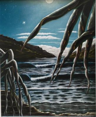 I changed the waves a couple of times and Mark agreed that they didn't look realistic. The ratty pandanus on the left was an afterthought, to add some balance. The moon wasn't there originally and I had just lightened the sky to represent it. The added moon was another afterthought, as well as the stars. The highlights on the leaves went through many changes. White, various blues and finally off-white.