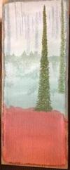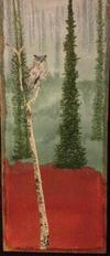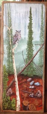 This painting is on a framed piece of gessoed burlap. It is "based" on a photograph taken near Mount Hood in Oregon. The owl in the photo was too small so I used a different owl picture enlarged to the size I needed.