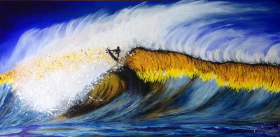 Just finished this today. Acrylic on stretched canvas, 910 x 460. The thrill of going for a big 'air' whilst the sunset light plays on the face of the wave.